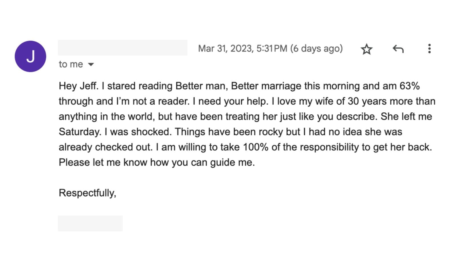 A year ago, my marriage was on the verge of ruin, and I had no idea how to fix it. Jeff was an absolute godsend. My marriage didn’t get better overnight — that took many months — but I was on the road to restoration after our first phone call. With Jeff’s help, my wife and I are closer as a couple and more intimate than we’ve ever been. After 15 years of marriage, I didn’t think this was possible.